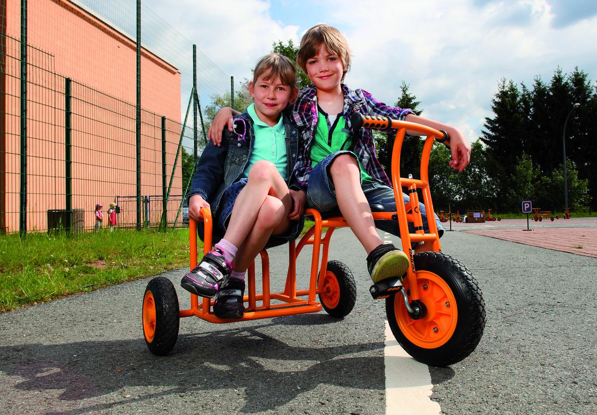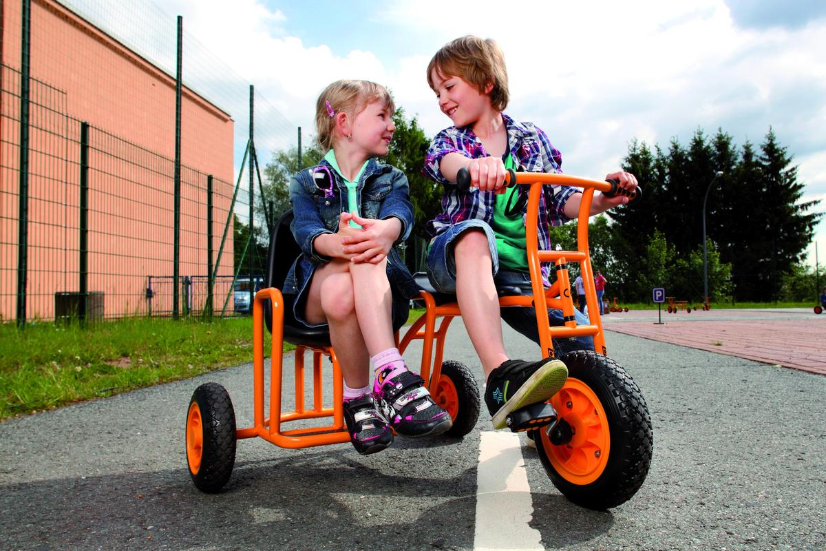 Seite an Seite die Fahrt mit dem Dreirad genießen! Das Dreirad „Seitenwagen“ eignet sich für zwei Kinder. Der Mitfahrer kann zudem die Aussicht nach vorn genießen.