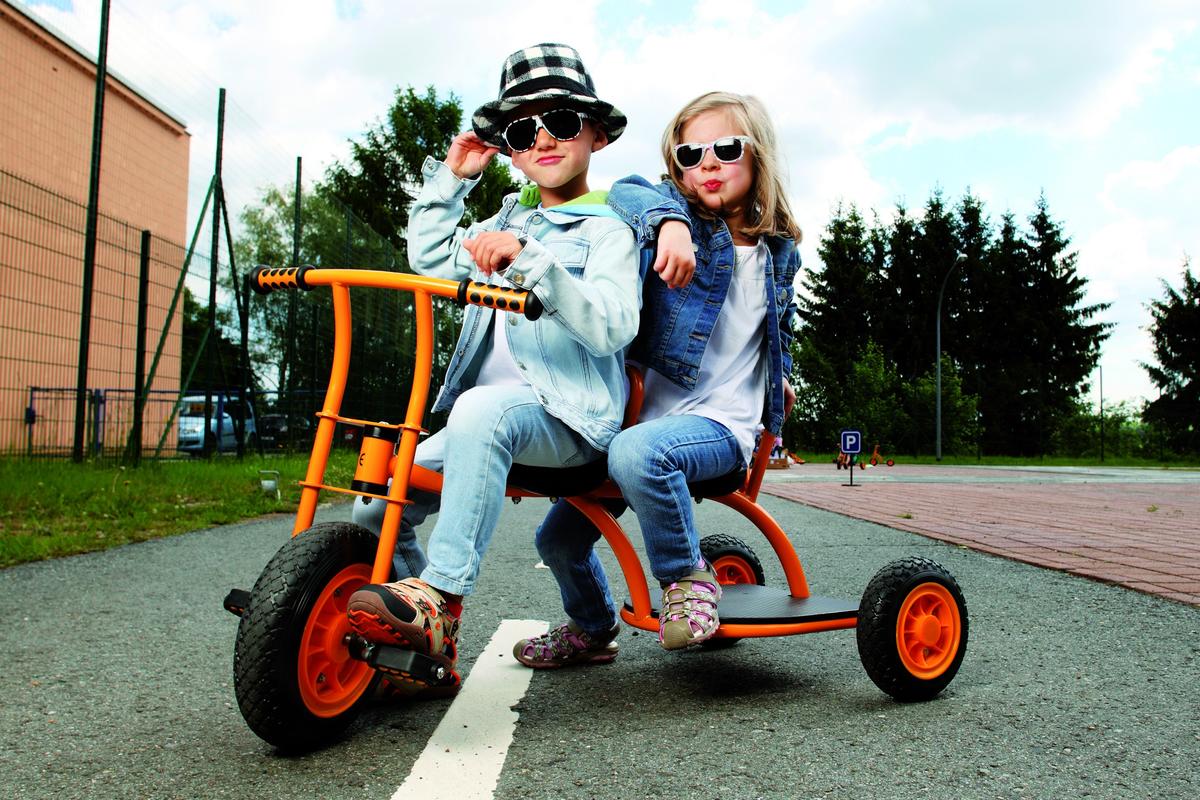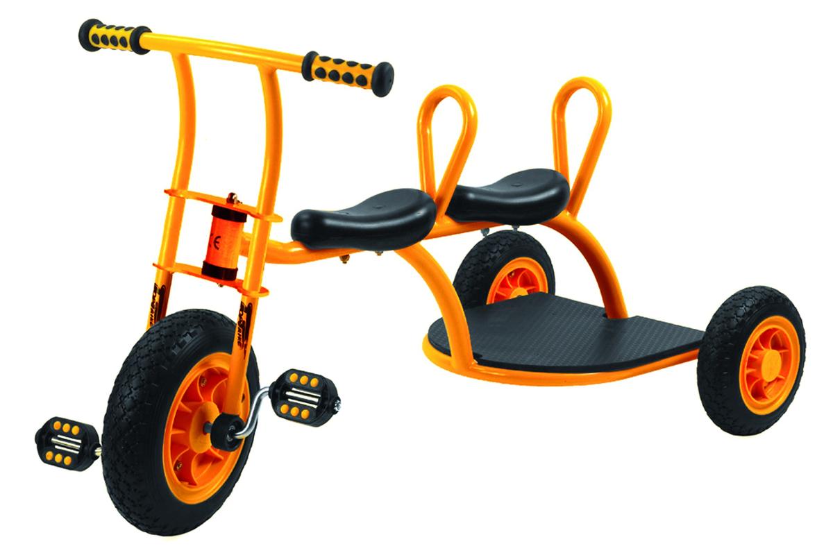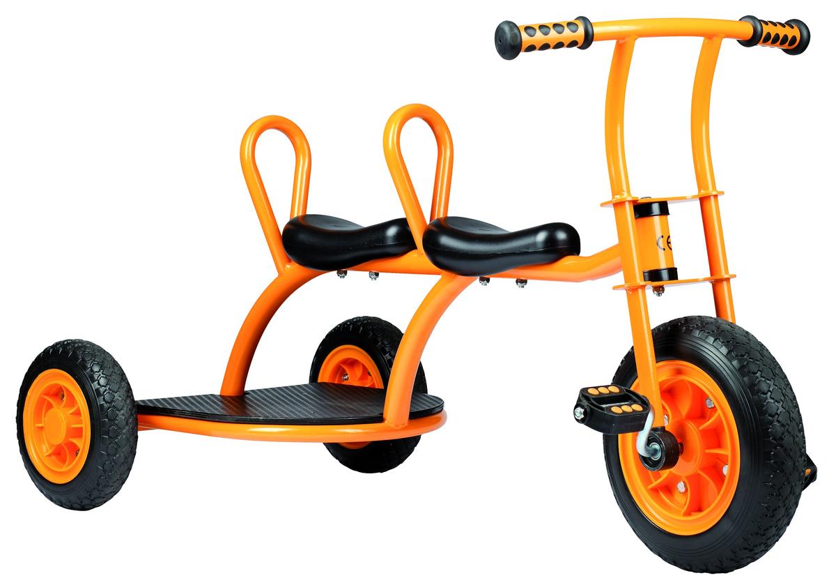 Mit dem Dreirad „Taxi“ lassen sich Freunde und Freundinnen ganz bequem chauffieren. Zwei Sitze sind hintereinander angebracht und ein Antirutschbrett gibt einem dritten Passagier einen sicheren Stand. Eine Rückenlehne an den beiden Sitzen sorgt für besonderen Komfort. Größe: 1120 x 560 x 640 mm. Alter: ab 3 Jahre.