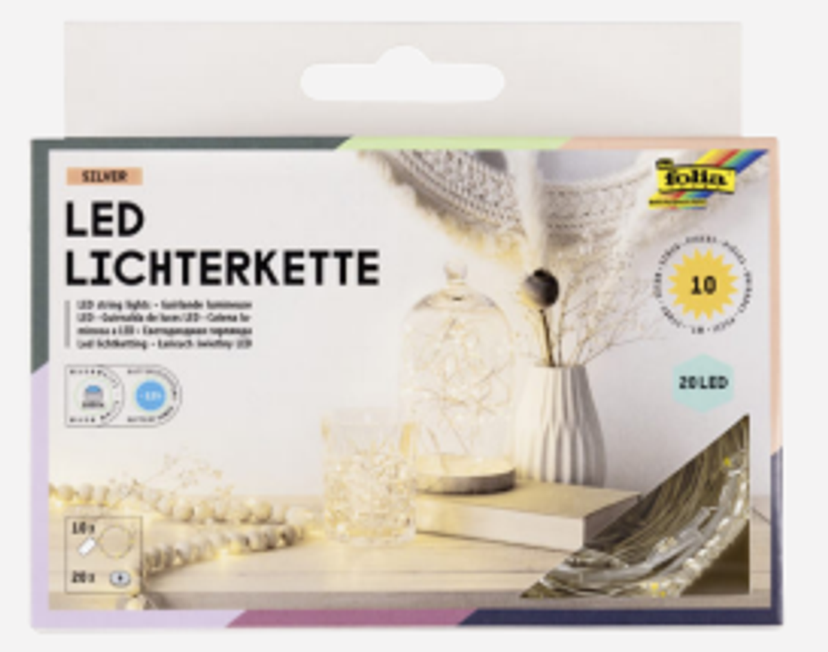 Lichterketten zaubern Gemütlichkeit. Egal ob auf einer Party oder einfach nur Zuhause – Wohlfühlatmosphäre macht sich im warmweißen Licht breit. Die zarte Lichterkette im neutralen Silber eignet sich prima, um Advents- und Dekokränze zum Strahlen zu bringen. Damit das Leuchten nicht allzu schnell vergeht, sind Ersatzbatterien im Set enthalten.