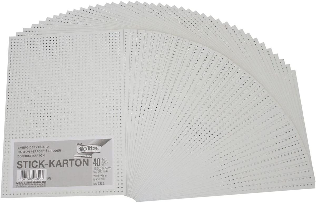 Mit diesem Stickkarton sind der Fantasie keine Grenzen gesetzt. Sie erhalten 40 Blätter mit vorgestochenen Löchern. Jedes Blatt ist ca. 17,5 x 24,5 cm groß. Die Karten sind weiß und unbedruckt. So können die tollsten Motive selber gestaltet werden.