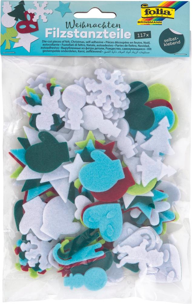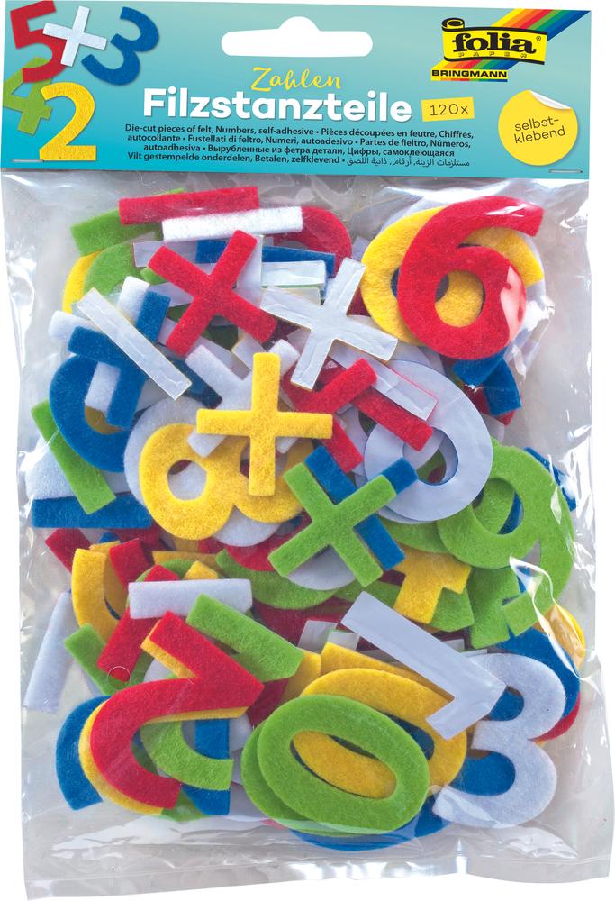 Sie erhalten eine Packung mit 150 selbstkbezogenen Filzstanzteilen in Form von Zahlen. Diese sind alle ca. 4,5 cm groß und in 5 Farben sortiert. Ideal vor allem für Kinder zum Verzieren diverser Bastelarbeiten.