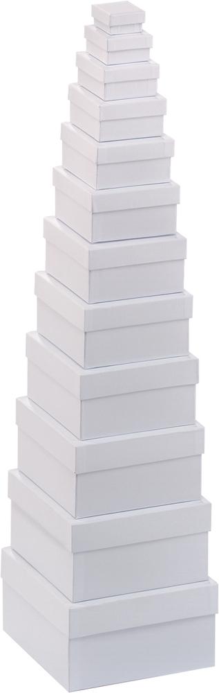 Sie erhalten ein Set bestehend aus 12 quadratischen Geschenkboxen in 12 unterschiedlichen Größen. Diese bestehen aus stabilem weißen Karton und eignen sich nicht nur als Geschenkbox, sondern genauso gut als Schmuckkästchen oder ähnliches. Sie können nach Herzenslust bemalt, beklebt oder anderweitig verziert werden. Die kleinste Schachtel hat eine Größe von ca. 3,5 x 3,5 x 2,0 cm und die Größte misst ca. 14,5 x 14,5 x 7,5 cm. Die Boxen lassen sich ineinander stecken und stapeln. Ideal auch als Geschenkverpackung für Ihre Liebsten.