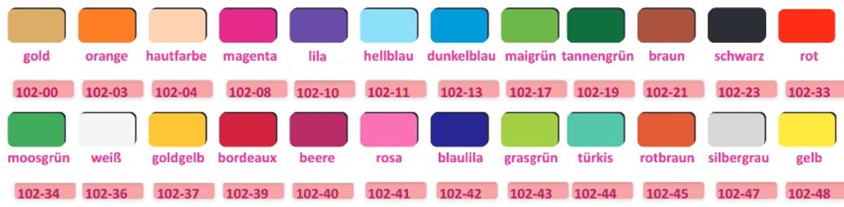 Farben: Gold, Orange, Hautfarben, Magenta, Lila, Hellblau, Dunkelblau, Maigrün, Tannengrün, Braun, Schwarz, Rot, Moosgrün, Weiß, Goldgelb, Bordeaux, Beere, Rosa, Blaulila, Grasgrün, Türkis, Rotbraun, Silbergrau und Gelb!