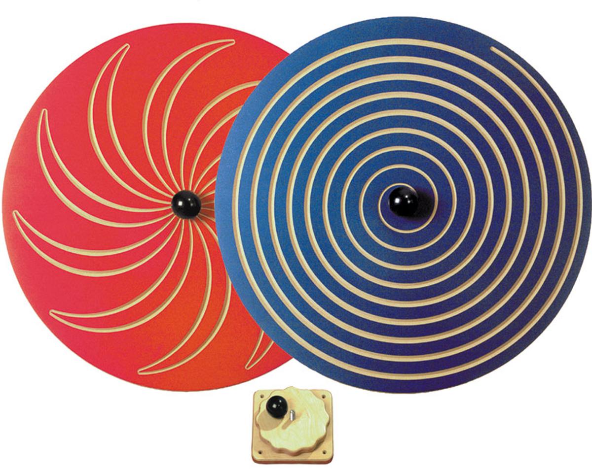 1 Holzkreisel 65 cm Durchmesser - durch einfachen Seitenwechsel von beiden Seiten spielbarblaue Seite mit Spirale - rote Seite mit Linien in Blumenform, stabile Wandbefestigung mit hochwertigem Industriekugellager für einen leichten, gleichmäßigen Lauf. Der griffige, schwarze Kunststoffknauf erlaubt den leichten und schnellen Wechsel der Seiten
